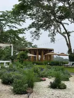 ✨ A cafe nestled amidst nature in Wang Nam Khiao, this cafe offers a stunning atmosphere, with views of trees, mountains, and even a flower garden. 💐🌸🌼 The shop is decorated with bamboo structures and offers multiple seating areas, both indoors and outdoors. Most importantly, there are beautiful photo spots everywhere.
