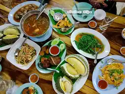 It's lunch time. We went to eat at Baan Isara Restaurant, a famous restaurant in Hua Hin that has been open for more than 30 years. The signature menu is #Stir-fried cockles with basil sauce on a hot plate.