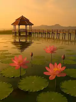 Khao Sam Roi Yot National Park is a perfect blend of towering limestone mountains, tranquil lotus ponds, and a wooden pavilion in the water, gracefully draped in the evening light.