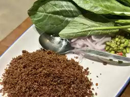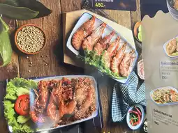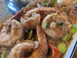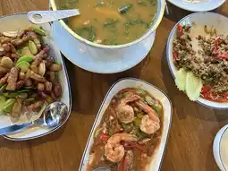 This small, air-conditioned restaurant, called "Ko Mak," is located on the side of the road with limited parking. It's best to call and make a reservation. I give the food four stars, as some of it is delicious. I loved the garlic shrimp, which was full of garlic, the "Ko Mak" pork, the "Grandma's" pork with squid, and the "Sour Curry with Bird's Eye Chili" sea bass. The food came out quickly, the portions were large, and the staff provided excellent service. The restaurant is air-conditioned and has plenty of tables. There are two rooms decorated in blue tones. There's a wide variety of food to choose from. For drinks, I ordered the pineapple roselle, which went well with the food. The price is in line with the quality of the food.