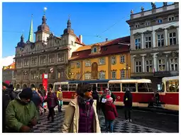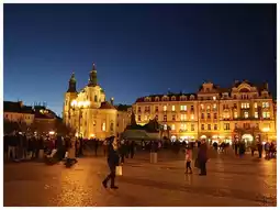 Historical buildings stand around the square, and in the center is a monument to the religious reformer Jan Hus.
