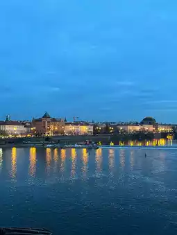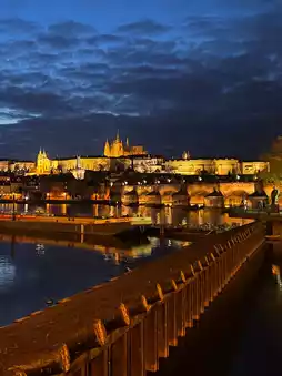 After sunset, as lights begin to illuminate the Vltava River, Prague transforms into a true 'City of Lights.' The distant view of Prague Castle and St. Vitus Cathedral, bathed in golden light atop the hill, appears almost as if they are floating serenely. Walking along the bridge, surrounded by the statues of saints, evokes the feeling of strolling through a medieval night.