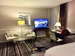 The hotel boasts comprehensive amenities, including an indoor pool, spa, and 24-hour fitness center.