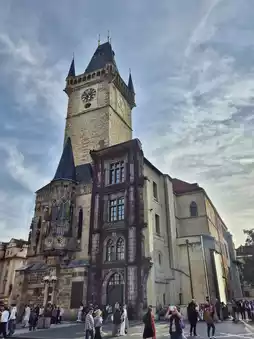 The Prague Astronomical Clock and the spire of the Church of Our Lady before Týn rise high into the sky, creating a picturesque square. Strolling among the ornate buildings, you'll experience the city's charm, a blend of medieval and modern. ☕👜✨