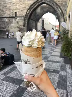 I heard the #ChimneyPancake shop right across Charles Bridge toward Prague Castle was delicious, so I chose the basic flavor and brought it to Charles Bridge to eat. But wait, a 🐝bee🐝 kept chasing my chimneypan, intent on eating it... It was so hard to eat! 🥲.