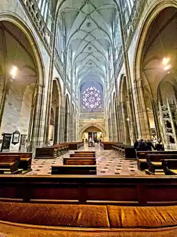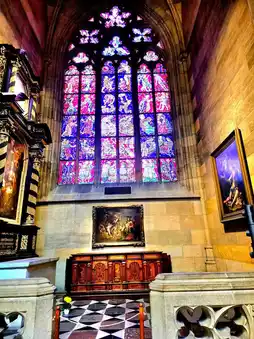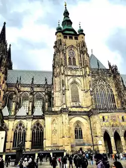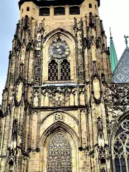 At the entrance, there is the Golden Gate adorned with mosaics, and the tomb of St. John of Nepomuk, a magnificent silver-decorated tomb. The St. Wenceslas Chapel is renowned for its ornate jewel decorations and murals. The cathedral's observation tower, accessible by climbing 287 steps, offers a panoramic view of Prague.