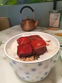 Four thick pieces of Dongpo pork are laid over rice. The meat is fragrant and tender, melts in your mouth, and the sauce is well braised, rich but not greasy, perfect with rice.