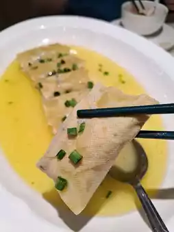 The bean curd skin wraps mustard greens and minced meat filling, served on a golden broth, with an elegant appearance and a fresh, savory taste.
