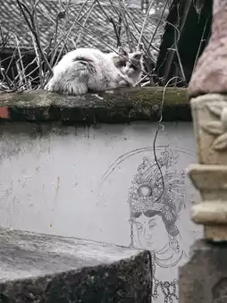 The temple has adopted more than 10 cats and dogs. On the wall, it says, "You can take pictures of the Buddha statues. Feel free to take pictures."
