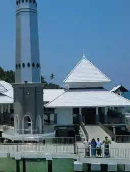 The mosque’s deck can be slippery when wet, so wear sturdy footwear. Be respectfully quiet inside, especially during prayers. The tropical sun is strong—bring sun protection even for short walks.