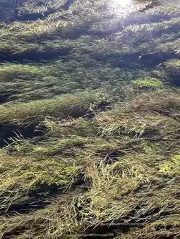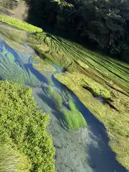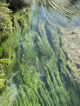📸 Use a wide-angle lens to capture the stream with floating aquatic plants and stunning blue-green gradients