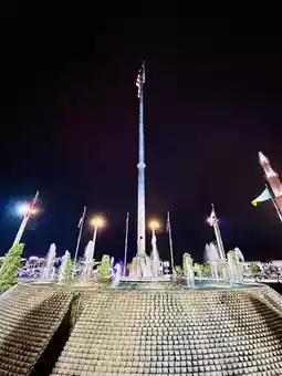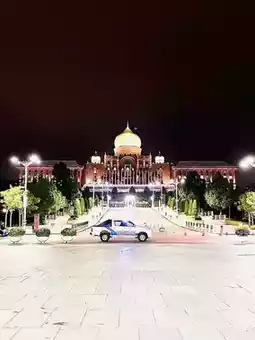 Encircling the square are the flags of all Malaysian states, with the national flag prominently displayed on a towering flagpole. Adjacent to the square is the iconic pink-domed Putra Mosque, constructed with rose-tinted granite and accommodating up to 15,000 worshippers.