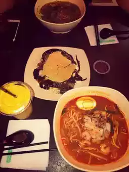 Share shrimp noodles & mango smoothie, and vegetables with sweet and spicy miso at the food court 🍤🥭