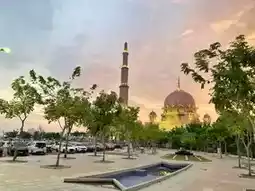 As the sun dips low over Putrajaya, Putra Mosque turns into a stunning silhouette against a sky painted with fiery oranges, pinks, and purples. Its delicate pink dome and elegant minaret glow softly in the sunset light, sparkling beside the calm lake.