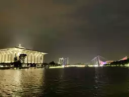 A night walk at Pantai Floria Putrajaya feels like a gentle escape into a world of lights and reflections. From the shore, the majestic Putra Mosque glows softly, while the Tuanku Mizan Zainal Abidin Mosque shines like silver under the night sky. The Seri Wawasan Bridge arches elegantly in the distance, its lights dancing on the water. Tucked away, a little secret garden awaits, where colorful lights twinkle in the trees, creating a magical, fairytale-like scene by the lakeside.