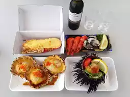 We chose a luxurious breakfast spread—lobster, sea urchin, prawns, oysters, and scallops—paired with a bottle of wine and enjoyed it by the harbor. Even in the rain, the peaceful view made it unforgettable.