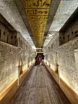 • The entrance to Ramses III’s tomb begins with a wide corridor, and step by step, you descend deeper into the tomb—each wall covered with vivid reliefs and inscriptions telling stories of gods, battles, and the afterlife ✨.