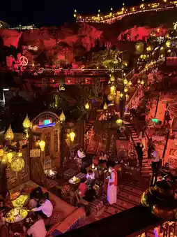 In Sharm El Sheikh, Egypt, there is a legendary café perched on a cliff where the desert meets the sea, exuding an atmosphere reminiscent of Aladdin's cave. This is Farsha Café. During the day, you can enjoy a leisurely tea while gazing at the pristine sea and sky, and at night, the space transforms into a magical realm illuminated by thousands of lamps. If you can visit only one café in Egypt, this is the place to be!