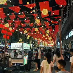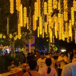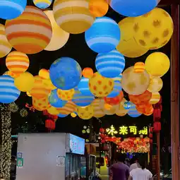 The stalls are divided into several sections on both sides, each decorated with unique designs like string lights, hanging cloths, and fish lanterns, making them beautiful for photos. It may not look full yet, but there are already quite a few. In the evening, the streets are bustling with diners, pedestrians, and the aroma of food fills the air!