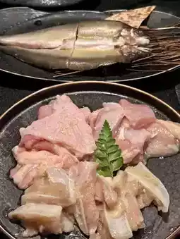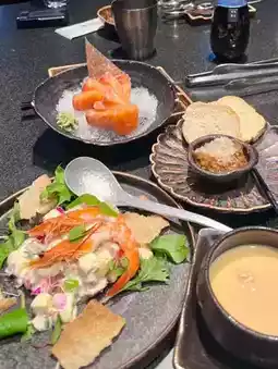 Starters include: salmon sashimi/soy milk cold tofu/fresh shrimp salad/