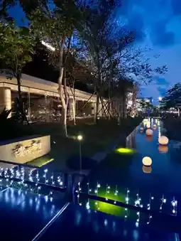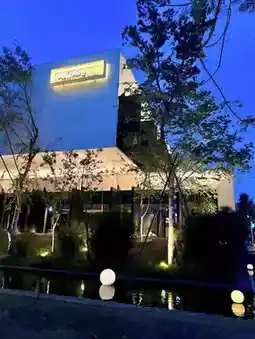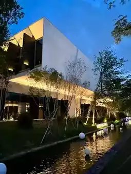 The architecture is very characteristic The exterior design is made of cement boxes built together and surrounded by trees and pools of water