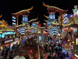 Qingdao's Mingyue Shanhai Jian Night City is a complex cultural tourism site themed on the mythological world of Shan Hai Jing, a nighttime attraction combining tradition and modernity. It has streets themed on the four divine beasts of the Red Bird, the Azure Dragon, the White Tiger, and the Black Tortoise, four large stages, 17 art performance spaces, and over 20 kinds of amusement rides and various themed performances. In addition, it is a popular place for gourmets because you can enjoy various street foods from all over the country and abroad.