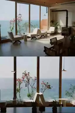 Floor-to-ceiling windows let you lounge while watching sunrise and sunset over the sea, creating a picture-perfect atmosphere. Every shot is Instagram-worthy.