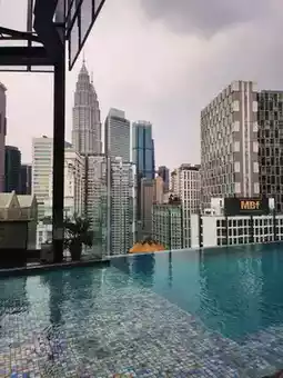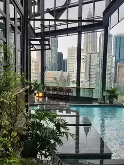 This is the Grand Hyatt Hotel, a brand-new luxury hotel in Malaysia. It features a swimming pool, making it an excellent place to stay. It's perfect for a trip with your girlfriend.