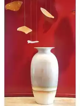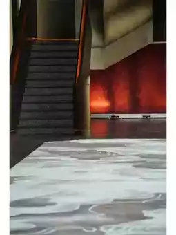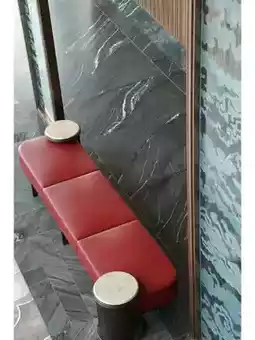 The elevator goes directly to the 51st-floor sky lobby. As the "car" doors open, a floor-to-ceiling antique shelf displays a rich variety of painted ceramic vessels and ornaments. The three-story-high sky lobby is strikingly decorated with red elements.