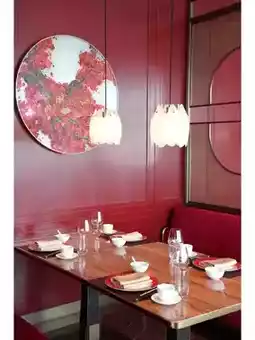 The 50th-floor Royal Garden Chinese Restaurant is inspired by the Penglai fairyland. The most eye-catching feature is the golden winter jasmine flower sea hanging from the ceiling, with hand-blown petals scattered freely above the restaurant, swaying passionately. The restaurant chairs are mainly in autumn red and ivory white, lively yet elegant. All images and texts I posted on Trip.com are sourced from the internet; please remove if infringing.