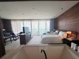 All rooms are 100㎡ sea view suites, each facing the sea. The only differences are the floor and orientation. The rooms have floor-to-ceiling glass windows, offering a 180° sea view. The rooms are very open, and even the partitions are movable.