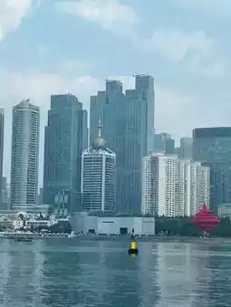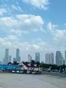 As soon as we arrived, we stopped at the Marine Center. The sea beyond the buildings was a deep blue, and the red sculptures of May Fourth Square were clearly visible at the end. Seeing this iconic cityscape in one glance made me realize, "Wow, I'm really in Qingdao!"