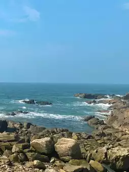 2️⃣ Lovers’ Dam: A walkway extending into the sea, flanked by jagged rocks and rolling waves, giving a feeling of being at the edge of the world
