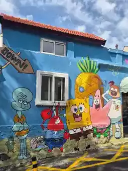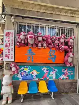 A mural street lined with cute souvenir shops. There are murals featuring Totoro, Ponyo, Tom and Jerry, Hello Kitty, and other popular characters like Crayon Shin-chan and Rabubu. People line up to take pictures in front of the murals. There's a cafe called One Coffee with a "Made in Qingdao" sign, which is also a popular photo spot.