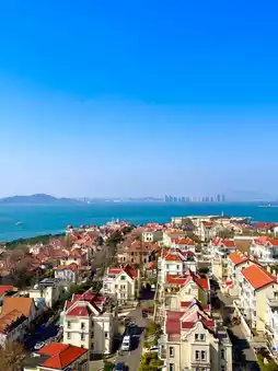 📌 The ultimate view of Qingdao! A panoramic view of the red roofs, the ocean, and the cathedral.
