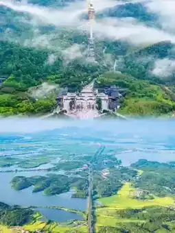 1️⃣ **Tiantai Temple's Hanging Plank Road**: Capture drone shots of the sea of clouds enveloping the red walls and golden roofs, creating a scene straight out of a Buddhist wonderland.