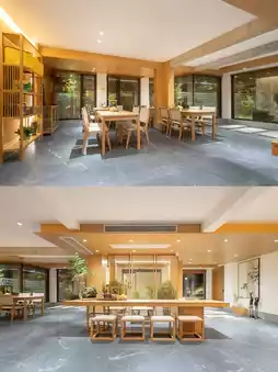 Covering 1,080 square meters, it features a modern Chinese style with a courtyard blending flowers, waterside pavilions, and mountain rocks to create a Zen atmosphere.