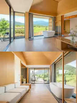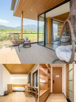 The spacious rooms come with oversized floor-to-ceiling windows and smart home systems. Some rooms feature hammocks or rocking chairs, and the terrace offers panoramic views of the green mountains.