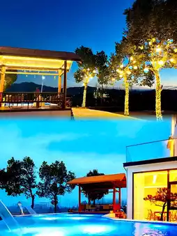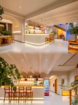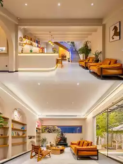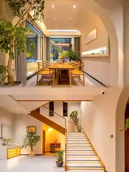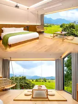 Hidden in the courtyard is a stunning infinity pool with crystal-clear water, blue and gem-like. During the day, soaking in the pool with green mountains overhead and a cool breeze feels like a Bali vacation. In the evening, warm yellow lights light up around the pool. Sitting by the pool with a cold drink, watching the sunset paint the sky orange and pink, creates a perfect romantic atmosphere for couples!