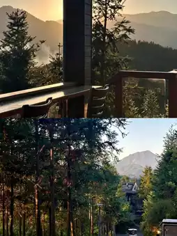 The room faces the mountain and forest landscape, and there is a terrace for viewing.