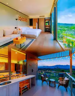 The resort has a really diverse range of room types. Each room is equipped with a private courtyard and private hot spring bath. The special facility, the Starry Sky Gate, is outstanding for taking photos and checking in. Some room types also have oversized floor-to-ceiling glass windows and large gardens. Waking up in the morning to the sunshine and the sound of birdsong makes you feel healed.