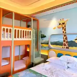 The lobby features a three-story glowing Tree of Life! Its roots are entwined with real moss, and a mechanical owl perched at the top announces the time. Kids rush to press the "Magic Tree Hole" button—poof! A lemongrass-scented mist sprays out, turning the whole family into walking aromatherapy diffusers! The rooms are even more magical: zebra-patterned kids' tent beds come with a built-in starry sky projector, and the bathroom windows face an animal corridor, so you can watch giraffes having a midnight snack while brushing your teeth—better than watching Discovery Channel!