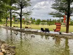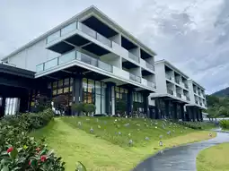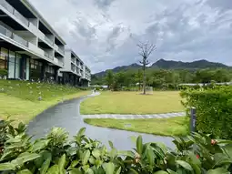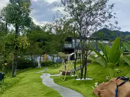 The hotel's bright white walls and cozy atmosphere create a relaxing atmosphere, creating a striking contrast with the green lawn, creating a refreshing and pleasant atmosphere perfect for photo opportunities.