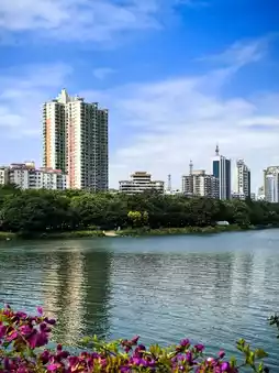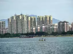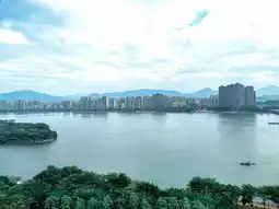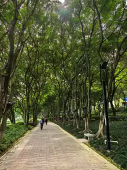 The riverside greenway on the north bank winds along the shore like a green ribbon. Camphor trees, banyans, and kapok trees create a patchy shade, their dense branches intertwining into a natural canopy. On the benches beneath the trees, elderly people rest with eyes closed, children chase and play, and cyclists ride through against the wind. Laughter and the sound of wheels blend into the river breeze. At the end of the greenway, several quaint pavilions can be faintly seen, contrasting with the scattered modern high-rises in the distance, sketching a cityscape where tradition and modernity merge.