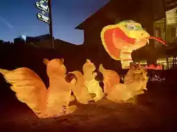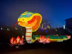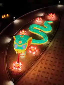 In the hotel garden, a dazzling "light and shadow snake" winds its way up to the top of the art installation, symbolizing the agility and wisdom of the New Year.