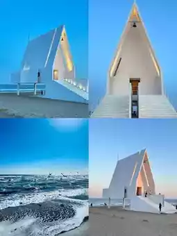 A minimalist white chapel with sea-facing cross windows framing the sky. Best photographed at dawn’s soft light or during low tide for "solitude" shots on the beach!
