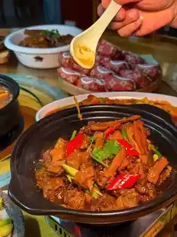 The signature hot spring roast goose is a must-try! The glossy, reddish-brown goose skin is incredibly crispy, while the meat is firm yet juicy. The unique ice-fire method is truly stunning—dip it in the scalding marinade and then simmer it in icy ginger, creating a thrilling clash of hot and cold. The accompanying blanched goose intestines are crispy and chewy, while the pan-fried goose liver is rich and fatty, bringing out the full flavor of the goose.