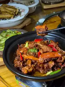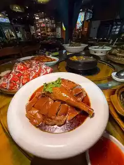 ✨ The hot spring roast goose is a must-try! Roasted over fruit wood, the skin is glossy and red, with a crisp, almost flaky crunch. The goose meat is incredibly tender and juicy, and the aroma of fat explodes in your mouth without being greasy. Try the hot and cold method—dip it in the scalding marinade and then simmer it in icy ginger for a truly divine experience.
