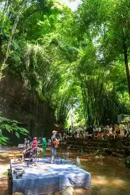 This is my favorite spot. The waterfall roaring among the bamboo forest is incredibly cool. In the afternoon, sipping coffee while listening to the folk concert is very relaxing.
