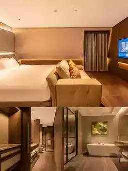 When I opened the door to my room, I was pleasantly surprised. The room was cozy and elegant, featuring wooden furniture paired with soft bedding that created a tranquil and comfortable atmosphere. The bedside lamp emitted a gentle glow, as if whispering a warm welcome. There were USB charging ports by the bed, a bathroom with separate wet and dry areas, anti-slip mats in the shower, and even pre-heated mouthwash cups that felt warm to the touch. After a tiring day exploring Longsha Park, I collapsed onto the mattress and felt an instant sense of relief. Even my travel companion remarked, "This bed is more inviting than the one at home."